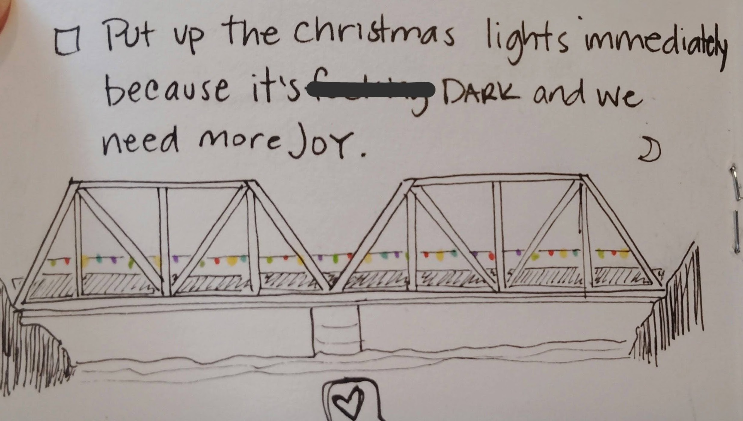And I drew a picture of the bridge with the lights strung on it. And I mostly followed through on those commitments and I did put up the lights. And I’ll tell you what: The lights are up on my house this year already too.